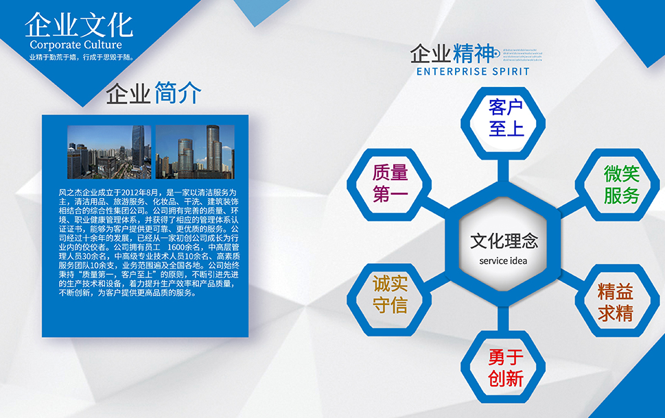 公司是一家以清潔服務(wù)為主,旅游,干洗、化妝品、裝修和餐飲相結(jié)合的多元化發(fā)展運(yùn)營的服務(wù)性企業(yè)。企業(yè)本著誠信第一、服務(wù)至上的原則,依靠公司盡我所能、力我所及的信條從2012年到現(xiàn)在服務(wù)了多家企業(yè),現(xiàn)在我們已經(jīng)擁有了400家左右的清潔服務(wù)項(xiàng)目和多家洗衣店。我們會(huì)一直牢記服務(wù),創(chuàng)新才是我們企業(yè)發(fā)展的服務(wù)宗旨。